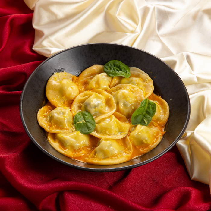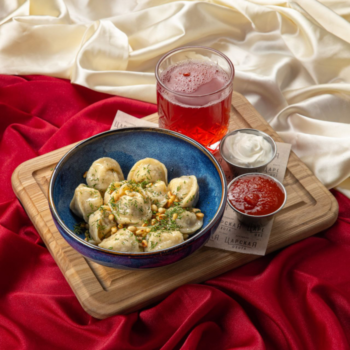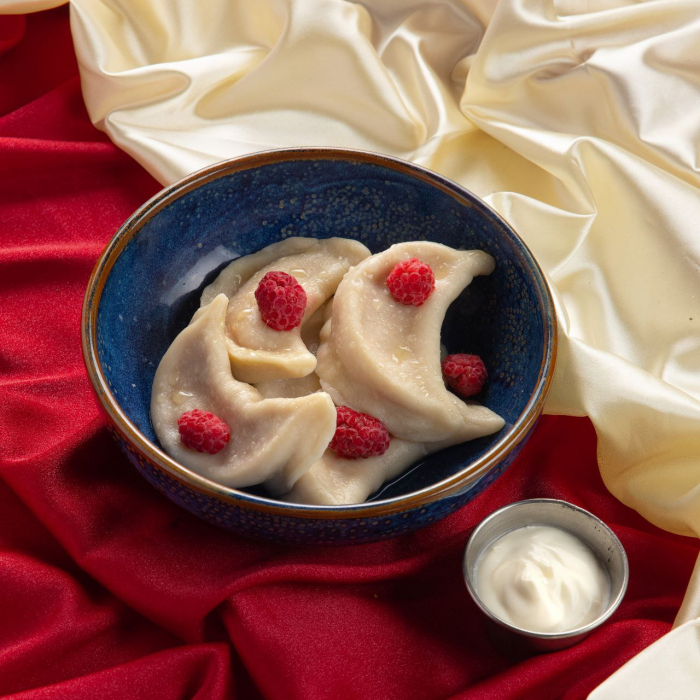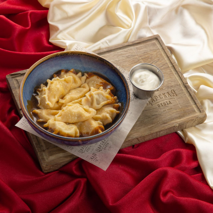 Вареники с картофелем и грибами и румяными шкварками и сметаной
