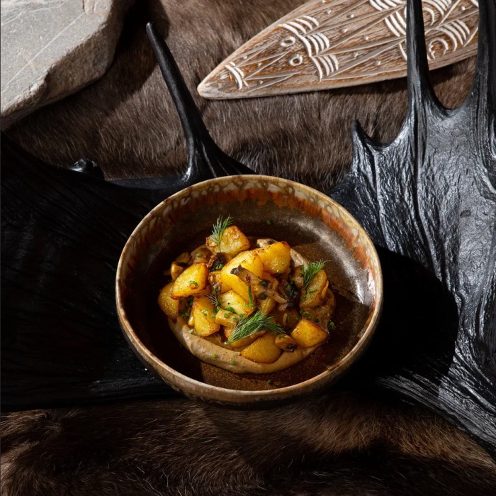 Жареный картофель с грибами и муссом из корнеплодов