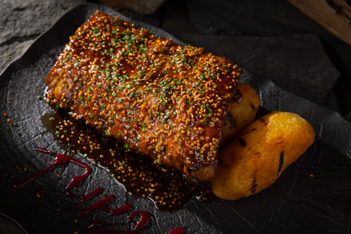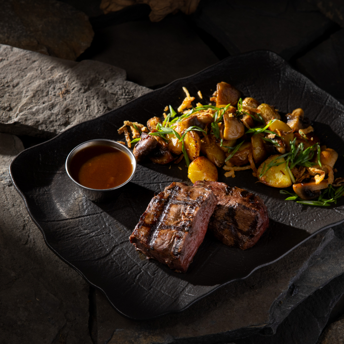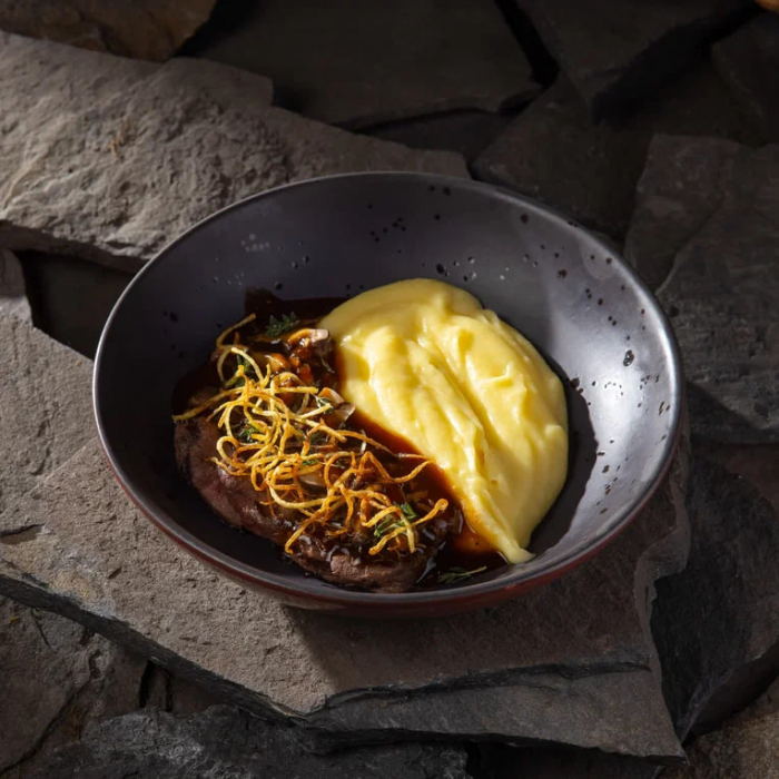 Говяжьи щечки томленые в печи с картофельным пюре, грибным жульеном и перечным соусом