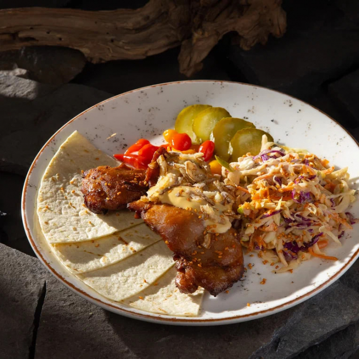 Куриное филе бедра гриль с коул слоу на лепешке с имбирным майонезом