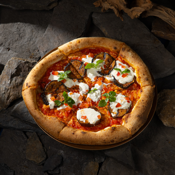 Пицца с баклажаном гриль, сыром страчателла