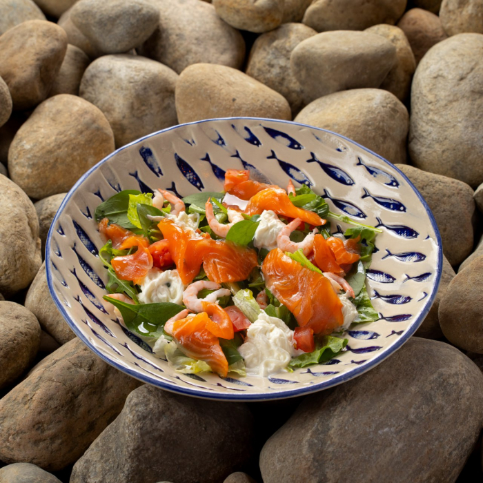 Мурманская копченая форель, северные креветки, томат, страчателла