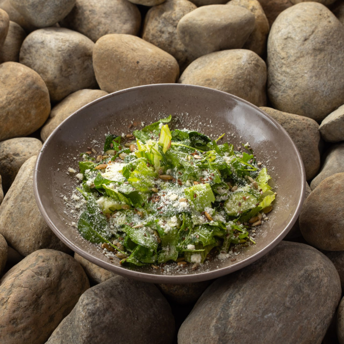 Зеленый салат, семечки, пармезан, цитрусовая заправка.